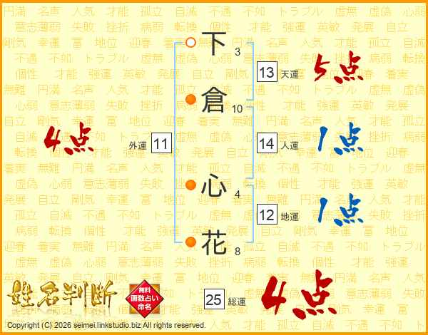 下倉心花さんの総運は25画の4点!