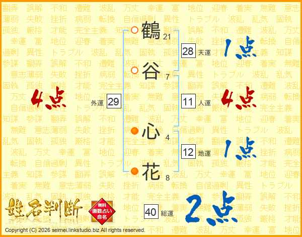 鶴(21画)谷(7画) 心(4画)花(8画)