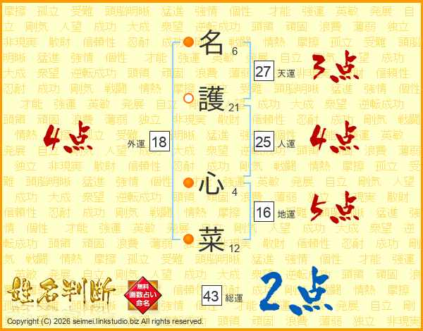 生活面を象徴する運勢です。外部から受ける影響力を表し、結婚運、家庭運や職場、環境への順応性を表します。総運から人運を引いた画数。姓や名が1文字の場合を除く。