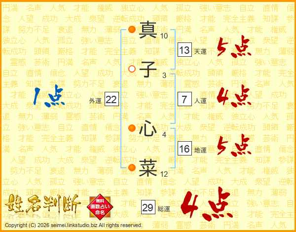 あなたの人生を表す1番重要な運勢です。生涯を通じて影響する総合運となり、主に50歳以降の晩年期に影響を及ぼします。苗字と名前の合計画数。