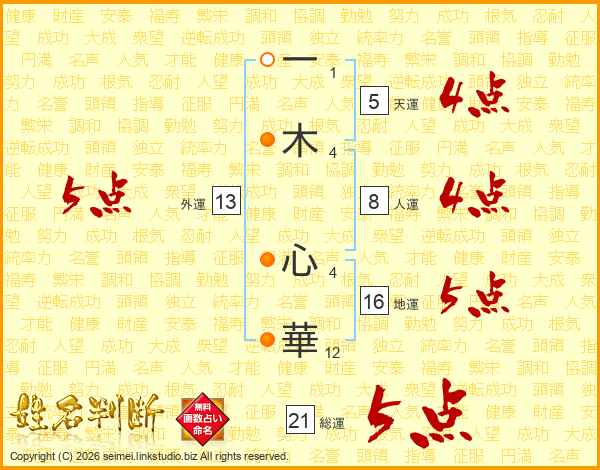 あなたの人生を表す1番重要な運勢です。生涯を通じて影響する総合運となり、主に50歳以降の晩年期に影響を及ぼします。苗字と名前の合計画数。