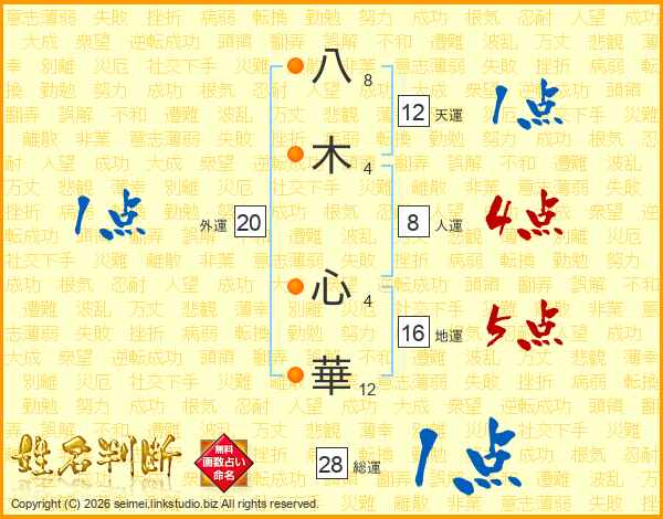 八(8画)木(4画) 心(4画)華(12画)