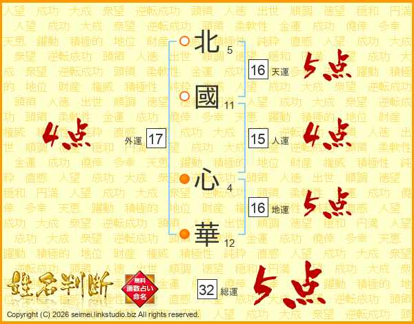 あなたの人生を表す1番重要な運勢です。生涯を通じて影響する総合運となり、主に50歳以降の晩年期に影響を及ぼします。苗字と名前の合計画数。