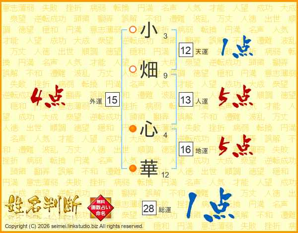 小(3画)畑(9画) 心(4画)華(12画)