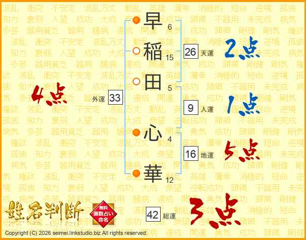 早(6画)稲(15画)田(5画) 心(4画)華(12画)