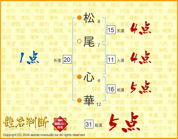 生活面を象徴する運勢です。外部から受ける影響力を表し、結婚運、家庭運や職場、環境への順応性を表します。総運から人運を引いた画数。姓や名が1文字の場合を除く。