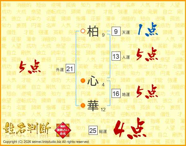 生活面を象徴する運勢です。外部から受ける影響力を表し、結婚運、家庭運や職場、環境への順応性を表します。総運から人運を引いた画数。姓や名が1文字の場合を除く。