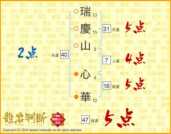 瑞慶山心華さんの総運は47画の5点!