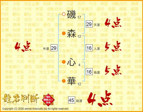 生活面を象徴する運勢です。外部から受ける影響力を表し、結婚運、家庭運や職場、環境への順応性を表します。総運から人運を引いた画数。姓や名が1文字の場合を除く。