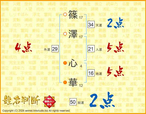 生活面を象徴する運勢です。外部から受ける影響力を表し、結婚運、家庭運や職場、環境への順応性を表します。総運から人運を引いた画数。姓や名が1文字の場合を除く。