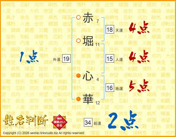 あなたの人生を表す1番重要な運勢です。生涯を通じて影響する総合運となり、主に50歳以降の晩年期に影響を及ぼします。苗字と名前の合計画数。