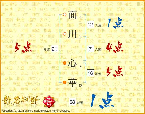 生活面を象徴する運勢です。外部から受ける影響力を表し、結婚運、家庭運や職場、環境への順応性を表します。総運から人運を引いた画数。姓や名が1文字の場合を除く。