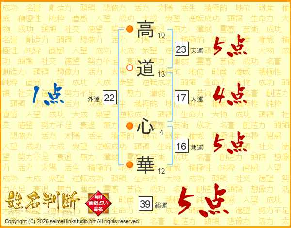 高道心華さんの総運は39画の5点!