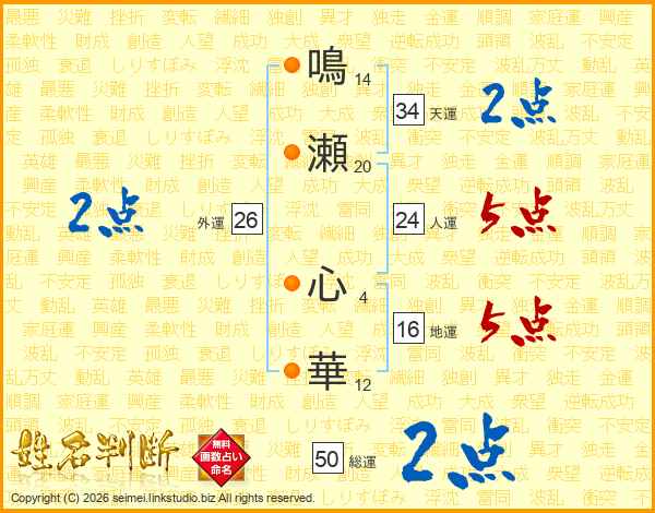 鳴(14画)瀬(20画) 心(4画)華(12画)