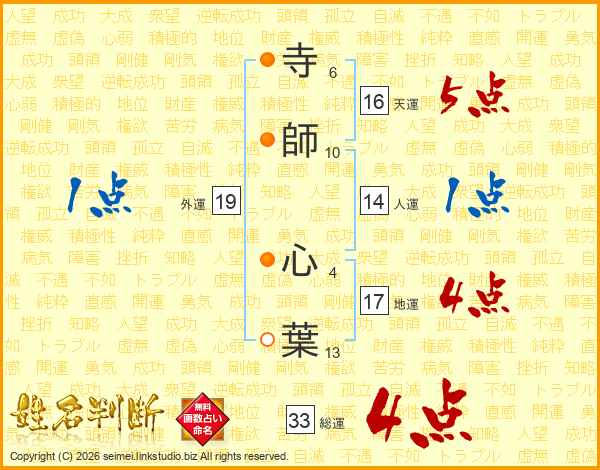 生活面を象徴する運勢です。外部から受ける影響力を表し、結婚運、家庭運や職場、環境への順応性を表します。総運から人運を引いた画数。姓や名が1文字の場合を除く。