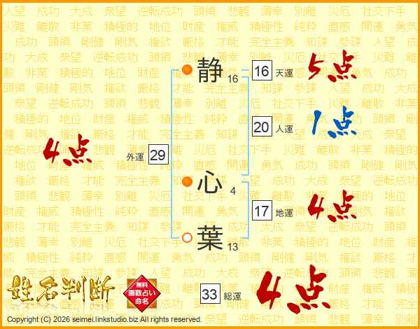 生活面を象徴する運勢です。外部から受ける影響力を表し、結婚運、家庭運や職場、環境への順応性を表します。総運から人運を引いた画数。姓や名が1文字の場合を除く。