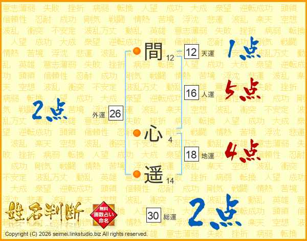 生活面を象徴する運勢です。外部から受ける影響力を表し、結婚運、家庭運や職場、環境への順応性を表します。総運から人運を引いた画数。姓や名が1文字の場合を除く。