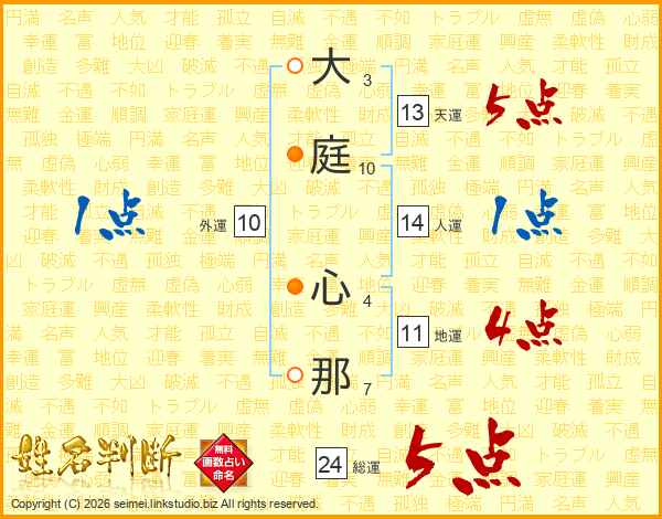 生活面を象徴する運勢です。外部から受ける影響力を表し、結婚運、家庭運や職場、環境への順応性を表します。総運から人運を引いた画数。姓や名が1文字の場合を除く。