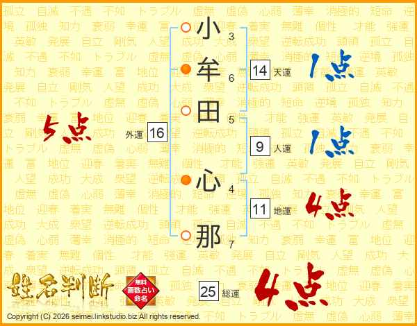 小(3画)牟(6画)田(5画) 心(4画)那(7画)