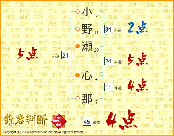 小(3画)野(11画)瀬(20画) 心(4画)那(7画)