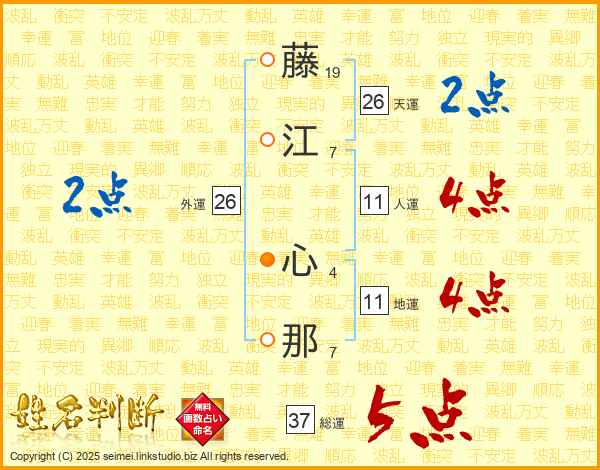 藤(19画)江(7画) 心(4画)那(7画)