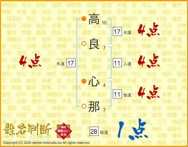 生活面を象徴する運勢です。外部から受ける影響力を表し、結婚運、家庭運や職場、環境への順応性を表します。総運から人運を引いた画数。姓や名が1文字の場合を除く。