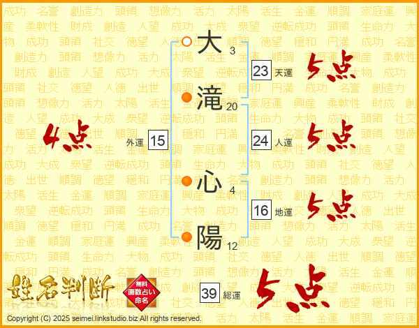 あなたの人生を表す1番重要な運勢です。生涯を通じて影響する総合運となり、主に50歳以降の晩年期に影響を及ぼします。苗字と名前の合計画数。