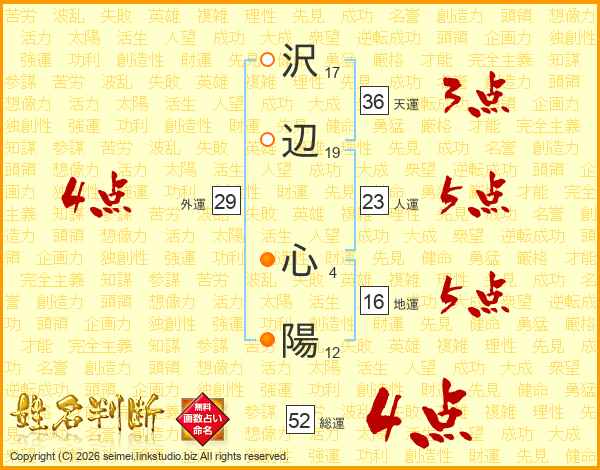 沢(17画)辺(19画) 心(4画)陽(12画)