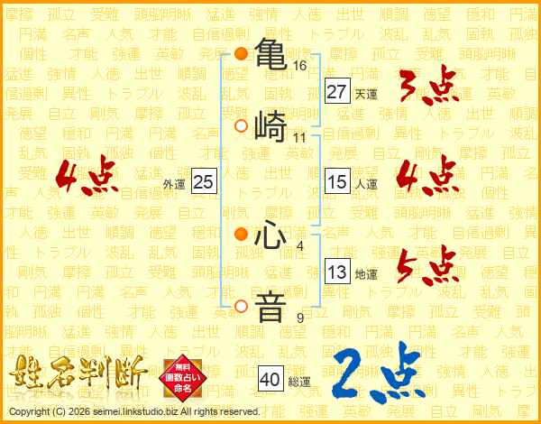 生活面を象徴する運勢です。外部から受ける影響力を表し、結婚運、家庭運や職場、環境への順応性を表します。総運から人運を引いた画数。姓や名が1文字の場合を除く。