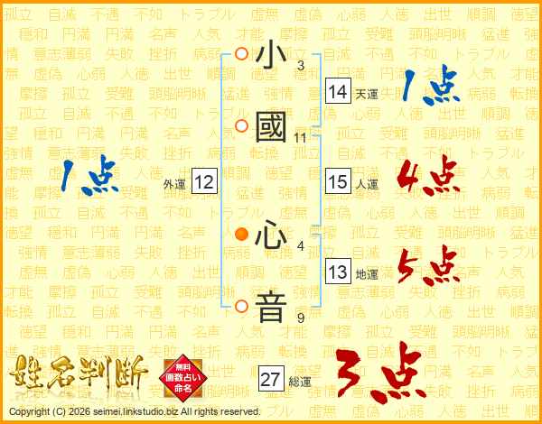 生活面を象徴する運勢です。外部から受ける影響力を表し、結婚運、家庭運や職場、環境への順応性を表します。総運から人運を引いた画数。姓や名が1文字の場合を除く。