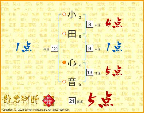 生活面を象徴する運勢です。外部から受ける影響力を表し、結婚運、家庭運や職場、環境への順応性を表します。総運から人運を引いた画数。姓や名が1文字の場合を除く。