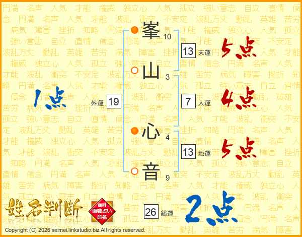 峯(10画)山(3画) 心(4画)音(9画)