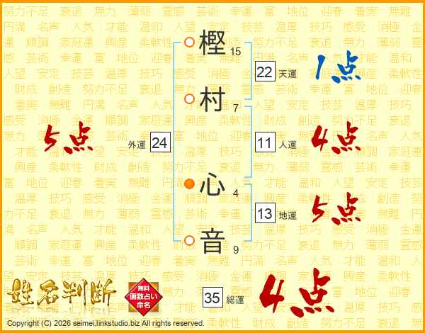 樫(15画)村(7画) 心(4画)音(9画)