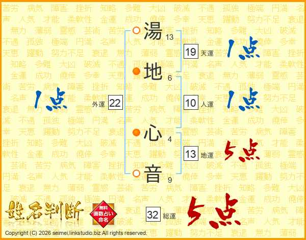 生活面を象徴する運勢です。外部から受ける影響力を表し、結婚運、家庭運や職場、環境への順応性を表します。総運から人運を引いた画数。姓や名が1文字の場合を除く。