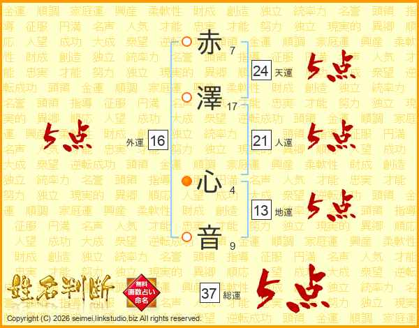 赤(7画)澤(17画) 心(4画)音(9画)