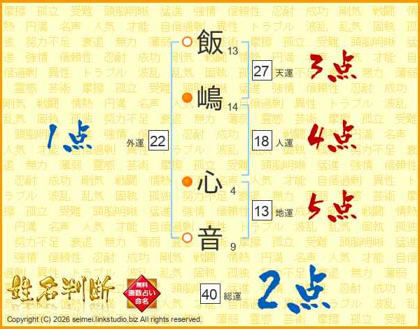 飯(13画)嶋(14画) 心(4画)音(9画)