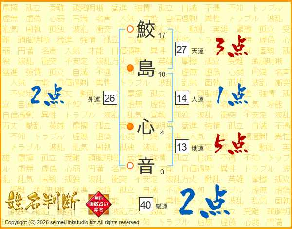 鮫(17画)島(10画) 心(4画)音(9画)