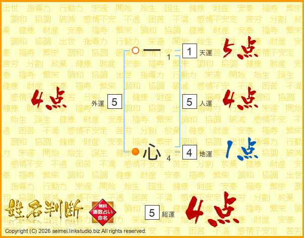 生活面を象徴する運勢です。外部から受ける影響力を表し、結婚運、家庭運や職場、環境への順応性を表します。総運から人運を引いた画数。姓や名が1文字の場合を除く。
