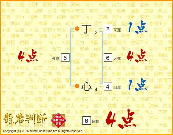 生活面を象徴する運勢です。外部から受ける影響力を表し、結婚運、家庭運や職場、環境への順応性を表します。総運から人運を引いた画数。姓や名が1文字の場合を除く。