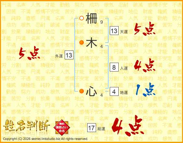 生活面を象徴する運勢です。外部から受ける影響力を表し、結婚運、家庭運や職場、環境への順応性を表します。総運から人運を引いた画数。姓や名が1文字の場合を除く。