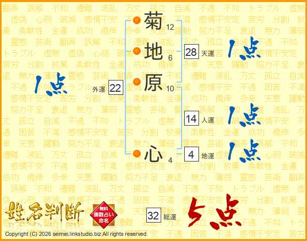 生活面を象徴する運勢です。外部から受ける影響力を表し、結婚運、家庭運や職場、環境への順応性を表します。総運から人運を引いた画数。姓や名が1文字の場合を除く。