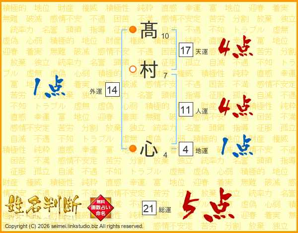 生活面を象徴する運勢です。外部から受ける影響力を表し、結婚運、家庭運や職場、環境への順応性を表します。総運から人運を引いた画数。姓や名が1文字の場合を除く。