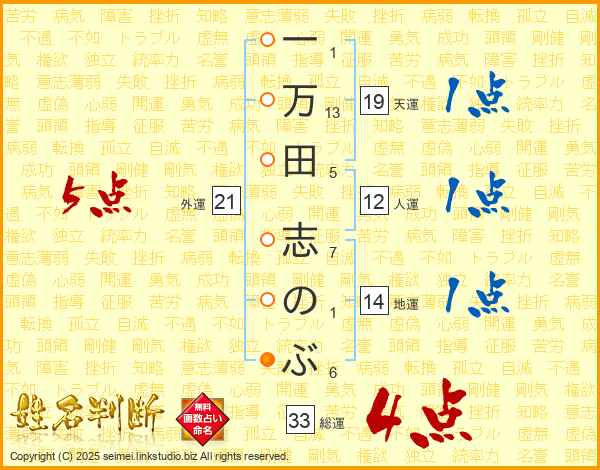 一(1画)万(13画)田(5画) 志(7画)の(1画)ぶ(6画)