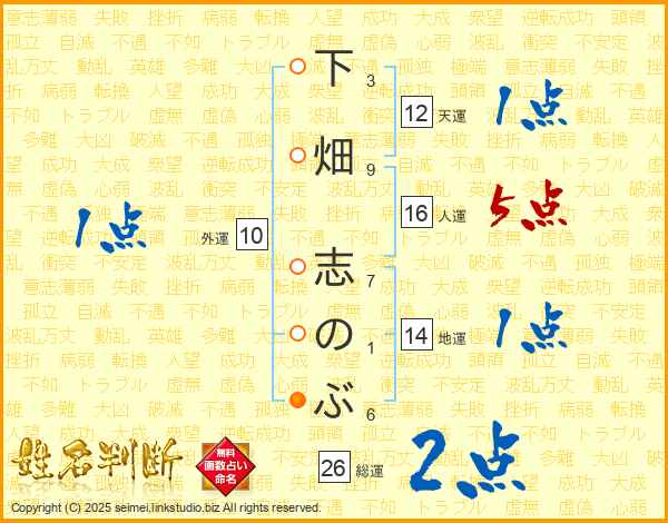 下(3画)畑(9画) 志(7画)の(1画)ぶ(6画)