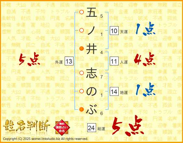 あなたの人生を表す1番重要な運勢です。生涯を通じて影響する総合運となり、主に50歳以降の晩年期に影響を及ぼします。苗字と名前の合計画数。
