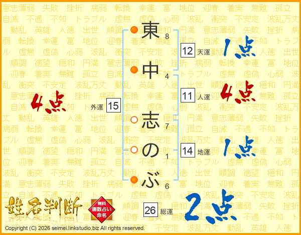 東(8画)中(4画) 志(7画)の(1画)ぶ(6画)