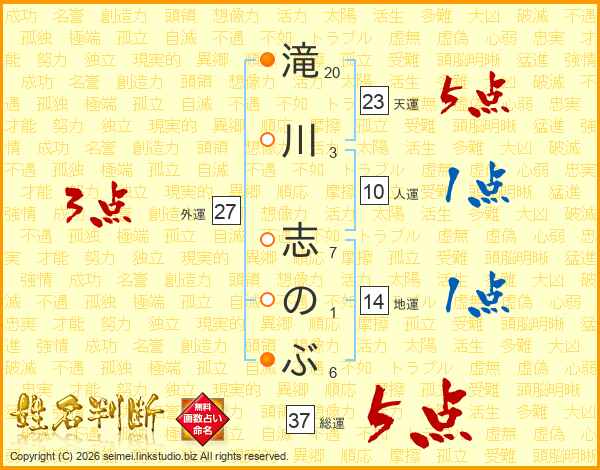 滝(20画)川(3画) 志(7画)の(1画)ぶ(6画)
