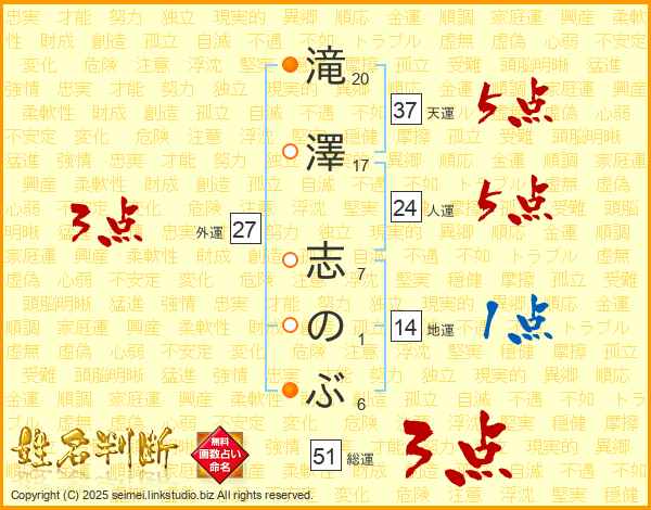 滝(20画)澤(17画) 志(7画)の(1画)ぶ(6画)