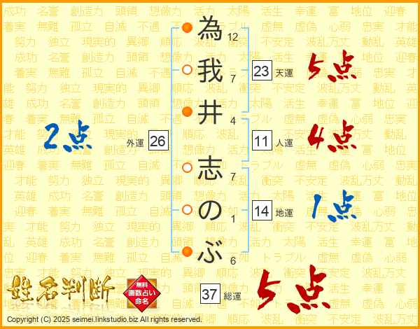 為(12画)我(7画)井(4画) 志(7画)の(1画)ぶ(6画)