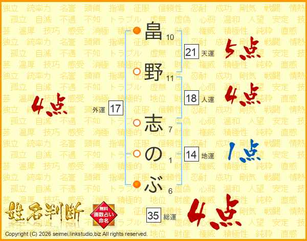 畠(10画)野(11画) 志(7画)の(1画)ぶ(6画)